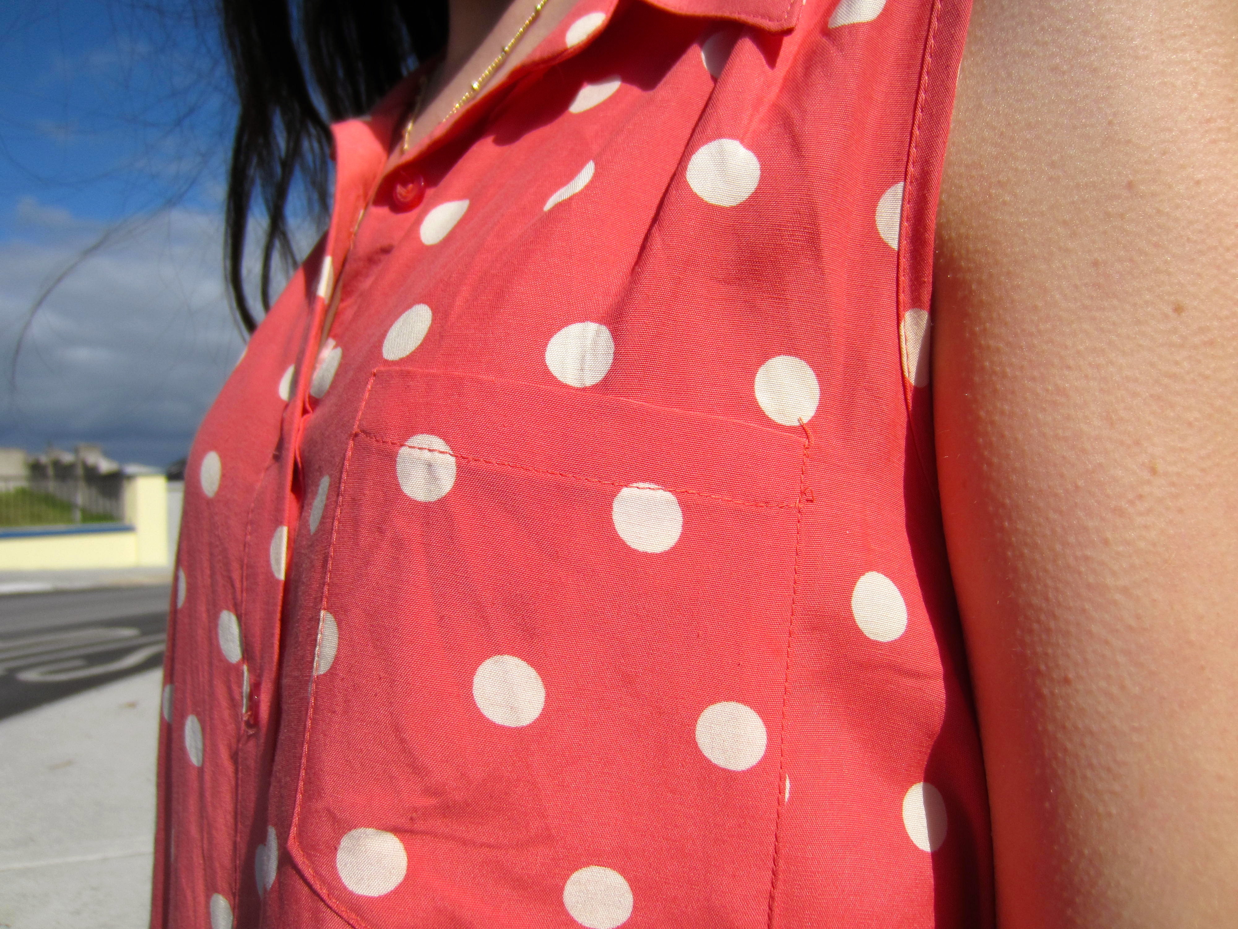 It’s Friday, it’s a bank holiday weekend and the sun is shining! Happy Faces all around I think. I know I say this every month but I can’t believe today is the last day of May. It seems like May started just a few short days ago. I swear I think the months are passing by faster and faster as we move through 2013. As I have mentioned before, the weather has a big impact on what I wear. As the sun was shining today and the temperatures have picked up, I wore a very summery outfit. To me, white jeans are such a summer item, and I paired them with this polka dot shirt and added my neon bag to complete the look. I love the contrast of the two strong colours in my outfit. I am so happy to able to wear flip flops again. It’s been far too long, and you know what they say… Life is better in flip flops. ๐
